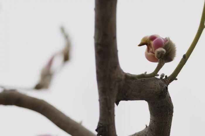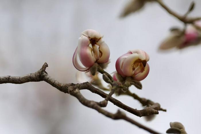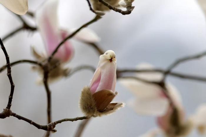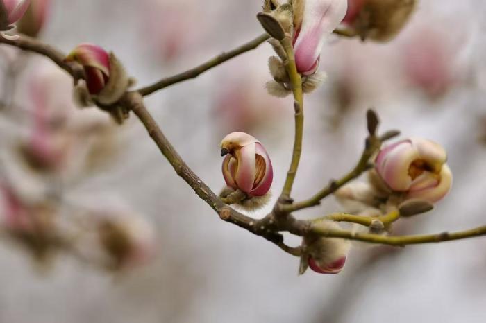 北京青年报记者在现场看到,这些含苞待放的玉兰花,花瓣微微卷曲的轮廓、深浅渐变的色彩,与小鸟的身形、羽色高度相似,部分花苞的顶端结构更仿若鸟喙,远远望去,仿佛一群粉白小鸟栖息在枝头,灵动可爱。