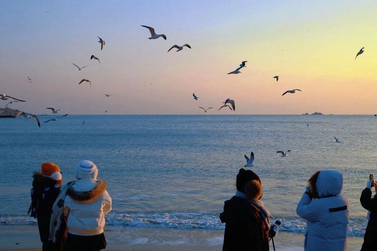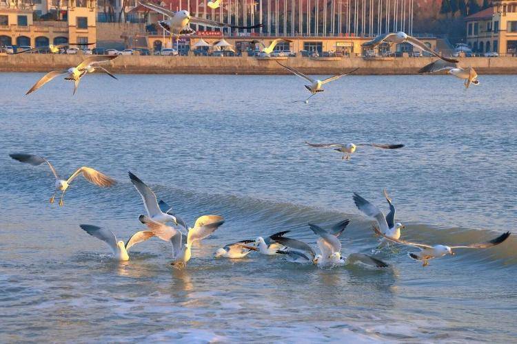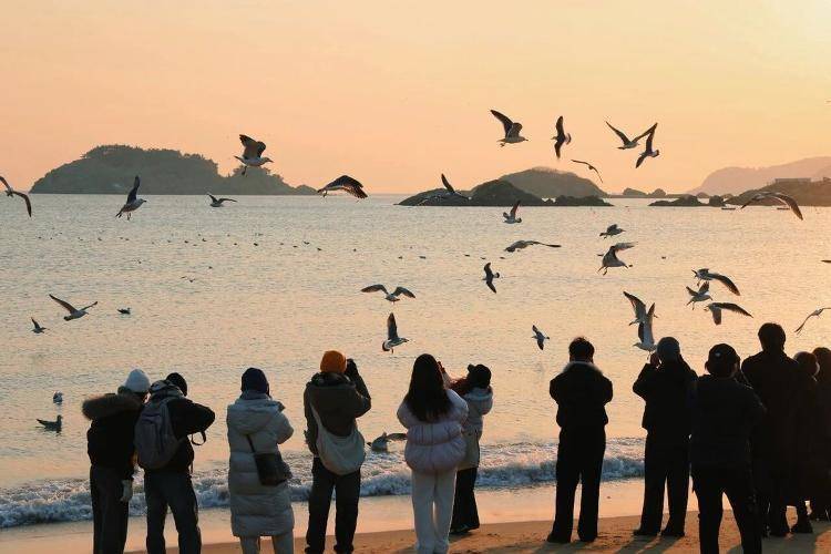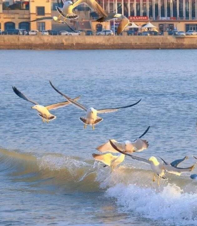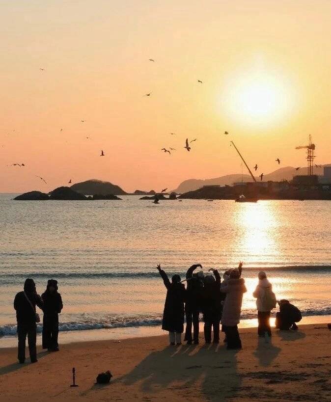 洁白的鸥群与橘色的日出、湛蓝的海水相映成趣,每一帧都如诗如画,自带治愈滤镜,成为摄影爱好者镜头下最动人的风景。