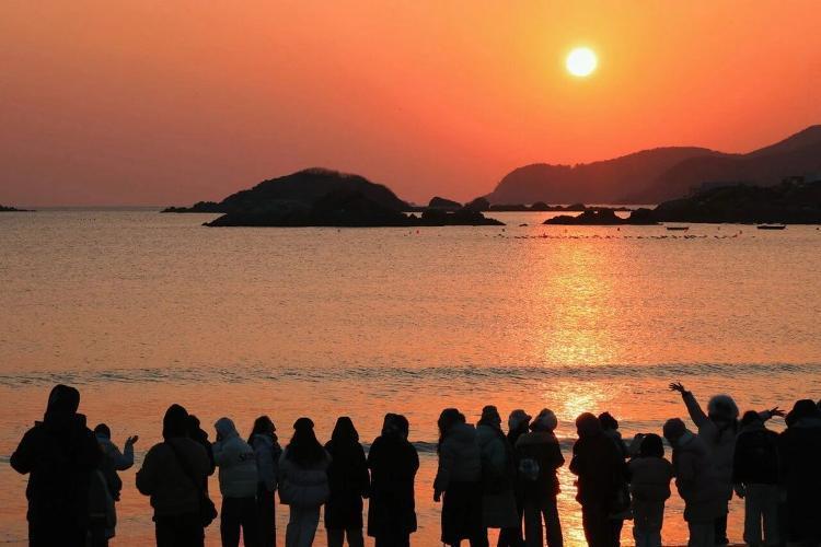 当第一缕朝阳冲破海平面的天际线,威海环翠区半月湾便被镀上了一层温柔的金色。海面从浅蓝渐变为橘粉,再过渡到耀眼的金红,每一寸波光都在诉说着清晨的浪漫。